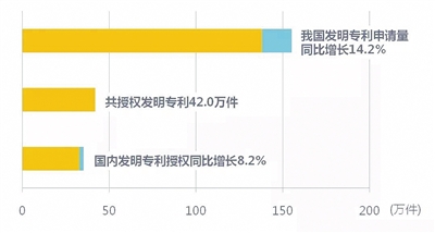 2017年,我国发明专利申请量为138.2万件,同比增长14.2%。共授权发明专利42.0万件,其中,国内发明专利授权32.7万件,同比增长8.2%。